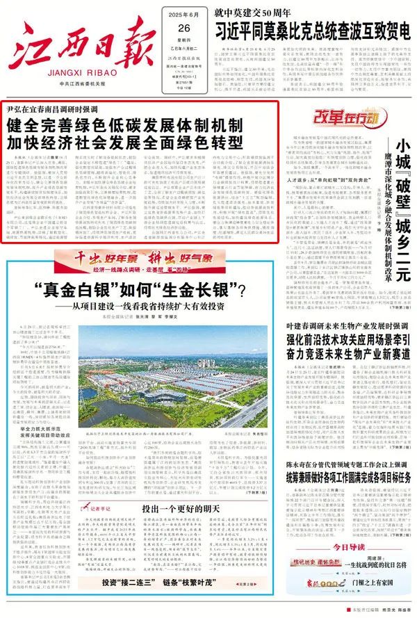 大江網(wǎng)/大江新聞客戶端訊 江西日?qǐng)?bào)全媒體記者魏星報(bào)道:6月25日,省委書記尹弘深入宜春、南昌,圍繞推進(jìn)綠色低碳發(fā)展體制機(jī)制改革進(jìn)行專題調(diào)研。他強(qiáng)調(diào),要深入貫徹習(xí)近平生態(tài)文明思想,以進(jìn)一步全面深化改革為動(dòng)力,健全完善綠色低碳發(fā)展體制機(jī)制,提升產(chǎn)業(yè)綠色低碳發(fā)展水平,構(gòu)建碳排放雙控制度體系,加快經(jīng)濟(jì)社會(huì)發(fā)展全面綠色轉(zhuǎn)型,讓綠色成為江西高質(zhì)量發(fā)展的鮮明底色。