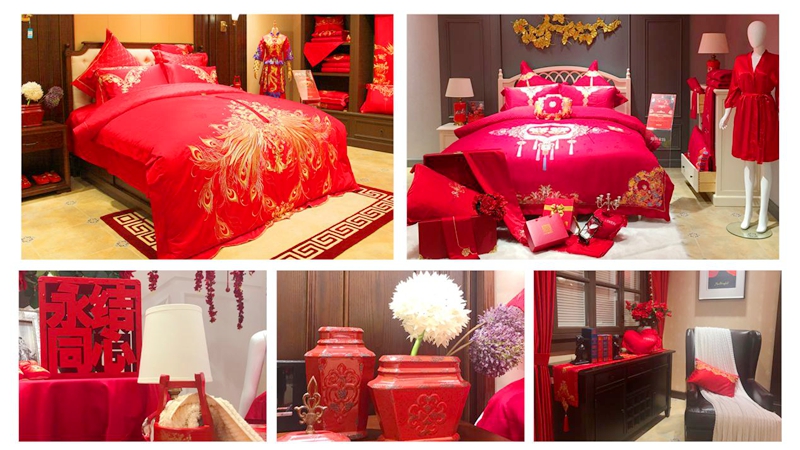 為帶給顧客更直觀舒適的消費體驗,在空間設(shè)計上,維科家紡和義店二樓婚慶家紡場景展示區(qū)摒棄了家紡行業(yè)傳統(tǒng)高柜+展床以求陳列面最大化的方式,將300余平方的空間分隔成7個實景樣板間,真實體現(xiàn)婚慶床品在日常家居生活中的應(yīng)用效果,也能滿足顧客在選購婚慶床品的同時,一站式解決對婆婆禮、長輩禮以及婚慶小件(子孫桶、火銃、虎頭鞋等)的需求。該區(qū)域設(shè)置了一大一小兩個洽談區(qū),配備了舒適的沙發(fā)以及精致的茶歇,以供顧客能夠坐下來向?qū)з徳敿毩私獯财返男畔?,以?yōu)質(zhì)的消費體驗,滿足顧客的選購需求。在陳列布置上,當(dāng)季新品醉紅妝、子孫滿堂、胭脂醉,熱銷品百子納福、麒麟賀滿堂等都直接鋪設(shè)于房間內(nèi),并搭配生活化的情景道具,供顧客選購。