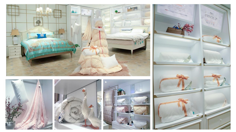芯類產(chǎn)品一直以來都是家紡行業(yè)銷售的大頭,為進一步提高和義店芯類產(chǎn)品銷售業(yè)績,公司對一樓原有空間進行重新規(guī)劃,特別開辟了80余平方的獨立芯類區(qū),設(shè)計上采用白色貨柜、鍍鈦金屬件、金屬玻璃柜的組合,使整個芯類區(qū)更加通透明亮。維科家紡主打的維科朵絨被、蠶絲被、石墨烯纖維被等都在該區(qū)域以展床、垂掛、卷筒等不同形式集中展示。此外,售價近三十萬的鎮(zhèn)店之寶——至尊冰島雁鴨絨被,也首次亮相和義店。