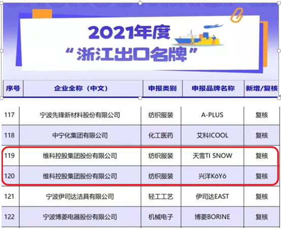 このほど、浙江省商務(wù)庁は、2021年度の「浙江輸出ブランド」のリストを発表した。維科グループ傘下の興洋KOYO、天雪TI SNOWの2つのブランドは順調(diào)に再審査を通過し、「浙江輸出ブランド」の栄譽を再獲得し、有効期間は3年(2022-2024年)である。