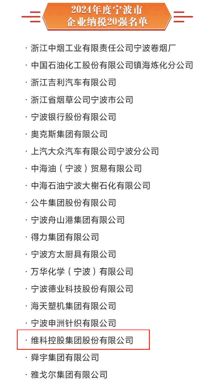 6月13日、2025年寧波市 「科學(xué)技術(shù)革新と産業(yè)革新の深い統(tǒng)合を促進(jìn)し、民間経済の質(zhì)の高い発展を加速するための會(huì)議 」と 「2025寧波起業(yè)家精神とイノベーションリスト 」リスト発表活動(dòng)が開催され、維科グループは、「2024寧波納稅トップ20企業(yè) 」賞を受賞した?!?024年寧波納稅トップ20企業(yè) 」を獲得した。